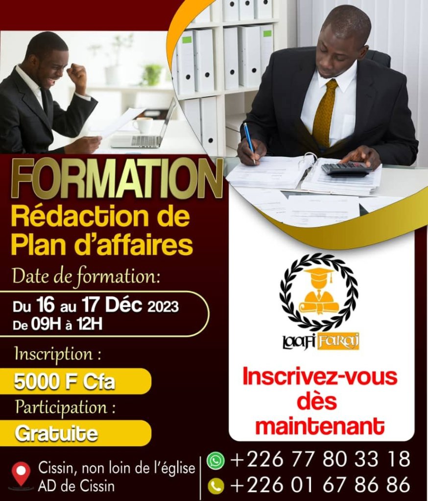 Souhaitez-vous savoir comment un business plan est-il structuré ? Quels peuvent être les éléments du business plan ? Comment planifier les actions dans le business plan ? Rendez-vous les 16 et 17 décembre 2023 au siège de la société Laafi Faraj à Cissin.